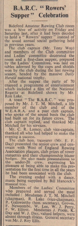 Bideford Amateur Rowing Club held a ‘Rowers’ supper’ with the following attendees – Tony Way, Messrs Mitchell, Ellis, Lamey, Day, Mesdames Mitchell, Lake, Galsworthy, Groves, Newcombe, Lee, Perry, Elliott and Poole.