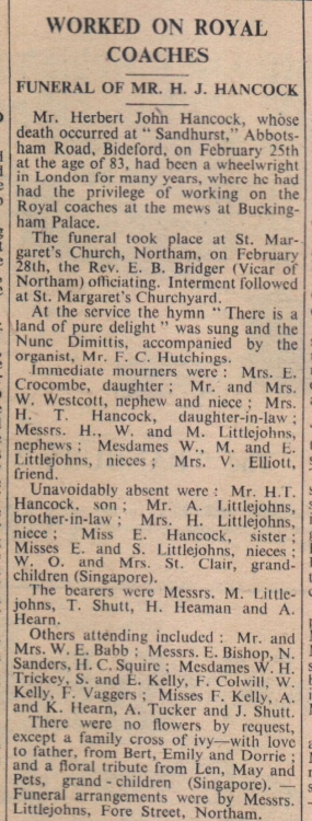 The funeral of Mr Herbert John Hancock, whose death occurred at Sandhurst, Abbotsham Road, Bideford, took place at St Margaret’s Church, Northam, with the Rev E B Bridger officiating. The bearers were Messrs M Littlejohns, T Shutt, H Heaman and A Hearn. Immediate mourners were Mrs E Crocombe, Mr and Mrs W Westcott, Mrs H T Hancock, Messrs H, W and M Littlejohns, Mesdames W, M and E Littlejohns and Mrs V Elliott.