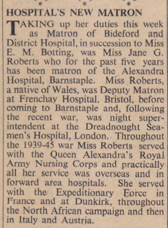 Miss Jane G Roberts takes up her duties as Matron of Bideford and District Hospital, in succession to Miss E M Botting.