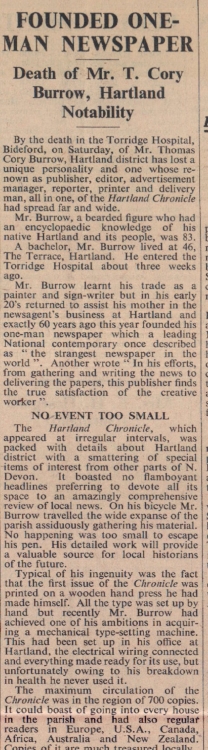 Hartland has lost a unique personality with the death of Mr Thomas Cory Burrow, 46 The Terrace. He was publisher, editor, advertisement manager, reporter, printer and delivery man of the Hartland Chronicle. The maximum circulation of the Chronicle was in the region of 700 copies and as well as parish readers, there were regular readers in Europe, USA, Canada, Africa, Australia, and New Zealand.