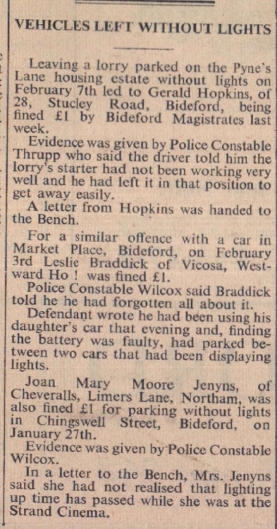 Gerald Hopkins of 28 Stucley Road, Bideford, Joan Mary Moore Jenyns of Cheveralls, Limers Lane, Northam, and Leslie Braddick of Vicosa, Westward Ho! were fined for traffic offences.