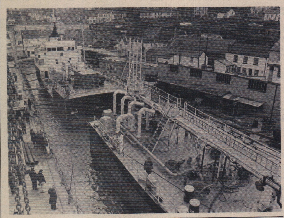 Ship surgery at Appledore where the Richmond dock is now being used by Appledore Shipbuilders Ltd for the lengthening of ships. After the ‘patient’ has been cut in half, the bow section is floated out to enable a new centre section to be manoeuvred in next to the stern section. Then the bow section is brought back and all three pieces are joined.