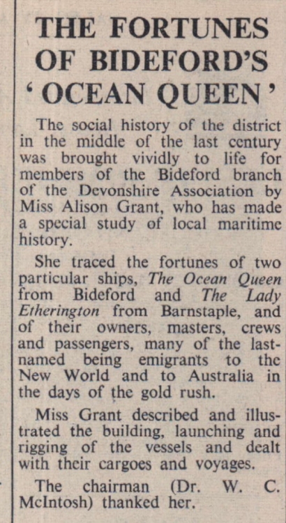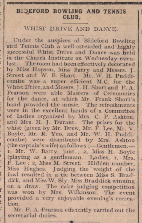 In sports news, Abbotsham Football Club defeated Appledore 3-1; the referee was Mr Langdon and the goal scorers for Abbotsham were Cloutman, Moase, and “one goal accidentally scored by a visitor”. A well attended meeting of the Bideford Bowling and Tennis Club (Tennis Section) was held at the Town Hall, 45 members being present with Mr M J Durant in the chair. A most successful season is promised, 77 members having been nominated. A draft of proposed Rules was presented and adopted. Mr J R Ellis was elected Captain, Miss M Meredity, vice-captain, and Mr J H Short, secretary. A Management Committee of seven was also appointed. The Bideford Bowling and Tennis Club held a well attended and highly successful Whist Drive and Dance.