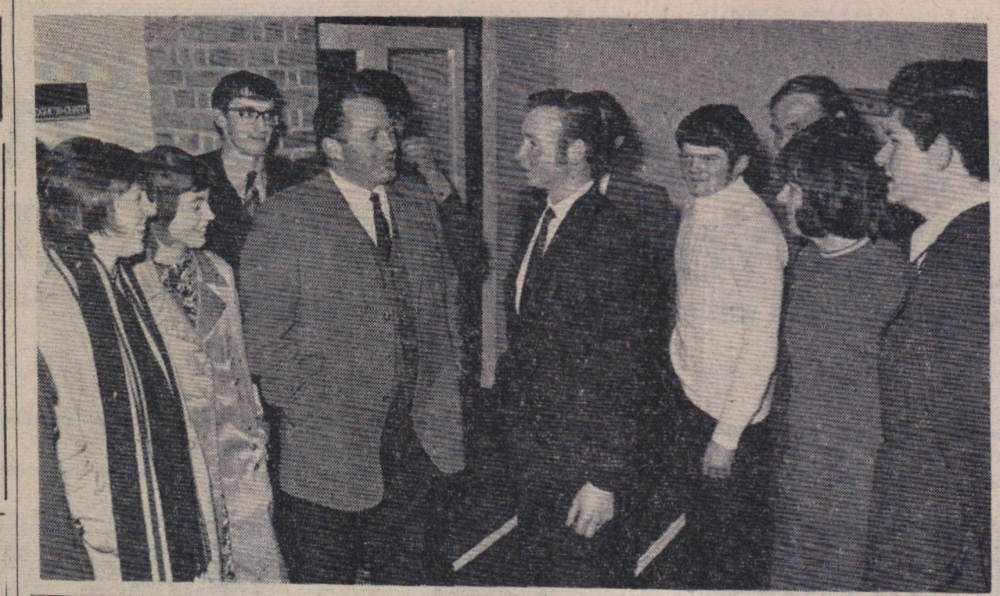 Buckland Brewer Young Farmers’ Club held an open ‘any questions’ competition at Parkham. Seen prior to the start are members of two competing teams with Mr M C Bird, of Northam, chairman for the evening.