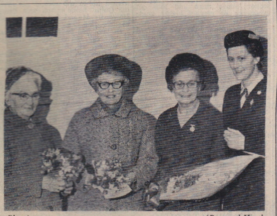 Thanks for long service on Girl Guides’ committee. Bideford Guides bestowed on a retiring committee member the highest honour they can bestow upon anyone outside the Guide movement. Mrs Hilda Fulford, who retired after 35 years on the committee, received the thanks badge from District Commissioner Mrs E Bowden. She was also presented with a bouquet by the secretary Mrs A Blackmore, on behalf of the president, Miss A E Lee, who was unable to attend the meeting. Two other committee members, Mrs R Featherstone and Mrs D Dymond, each retiring after 15 years’ service, received thanks letters from Mrs Bowden and posies from Guides. In the photograph are Mrs Dymond, Mrs Featherstone, Mrs Fulford and Mrs E Bowden. Speaking at the annual meeting the Mayor of Bideford, mr A P Hughes, noted the great amount of time, unrecognised by the general public, some people gave to the Guide movement. These people, however, must get immense rewards in seeing youngsters whom they had helped grow into first-class citizens, he added. Although new Guiders had joined them during the year they were again faced with the all-too-familiar position of having to appeal for people to give a few hours of their time helping with the various Companies or Packs in the area, said Mrs Bowden in her annual report. The waiting lists for both Brownies and Guides were rapidly reaching the stage where the lists would be larger than the Companies, she said.