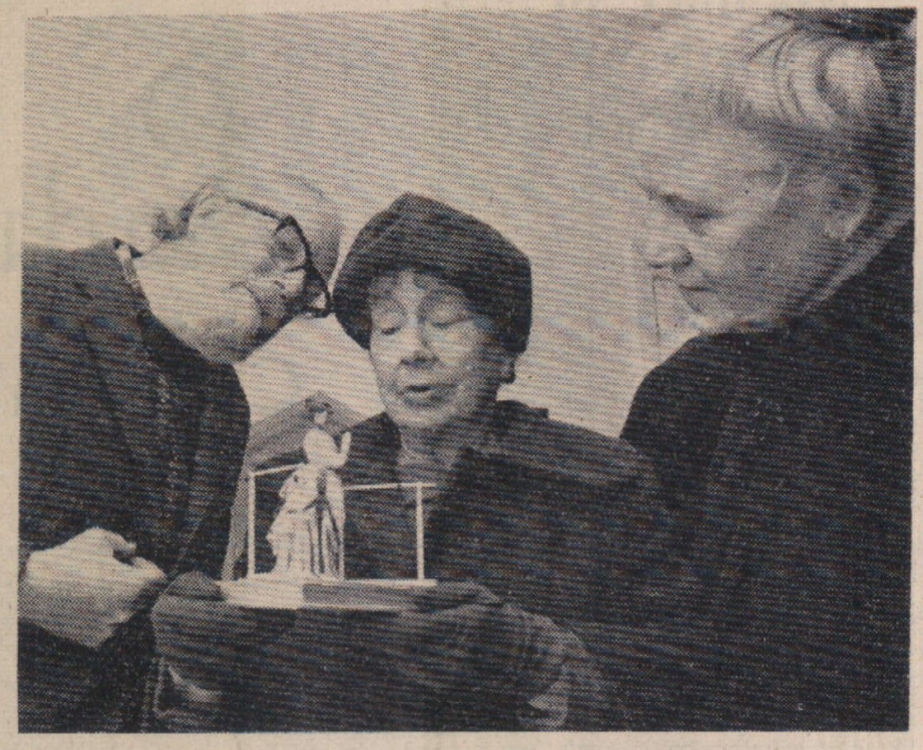 A Judith Ackland memorial exhibition was held at the Beaford Centre. She was a pupil at the Bideford School of Art and President of the westward Ho! Arts Society and her work was displayed in London. Miss Stella Edwards, her companion, and neighbours, Mr and Mrs F. Sutton from Bucks Mills, admire one of her models.
