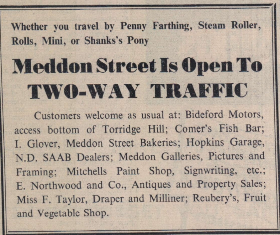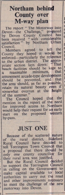 Linking N Devon with the M5. Proposals for a new major road route from the M5 to Barnstaple have been announced by Mr Peter Walker, Secretary of State for the Environment. The route, known as the North Devon link, will run from the M5 near Sampford Peverell to the proposed Barnstaple by-pass via Tiverton and South Molton. The scheme will be included in the trunk road preparation pool, and preparation and planning will be put in hand at once. The effect of these proposals, together with existing schemes for the by-passing of Barnstaple and Bideford, will be to provide an improve direct connection all the way from the M5 to Barnstaple, Bideford and towards Clovelly and Hartland area. Draft details will be published later showing the recommended line. The link will be about 35 miles long and should provide relief from traffic to a number of small towns and villages on the existing main route A361. Later in the month, the following article was printed.