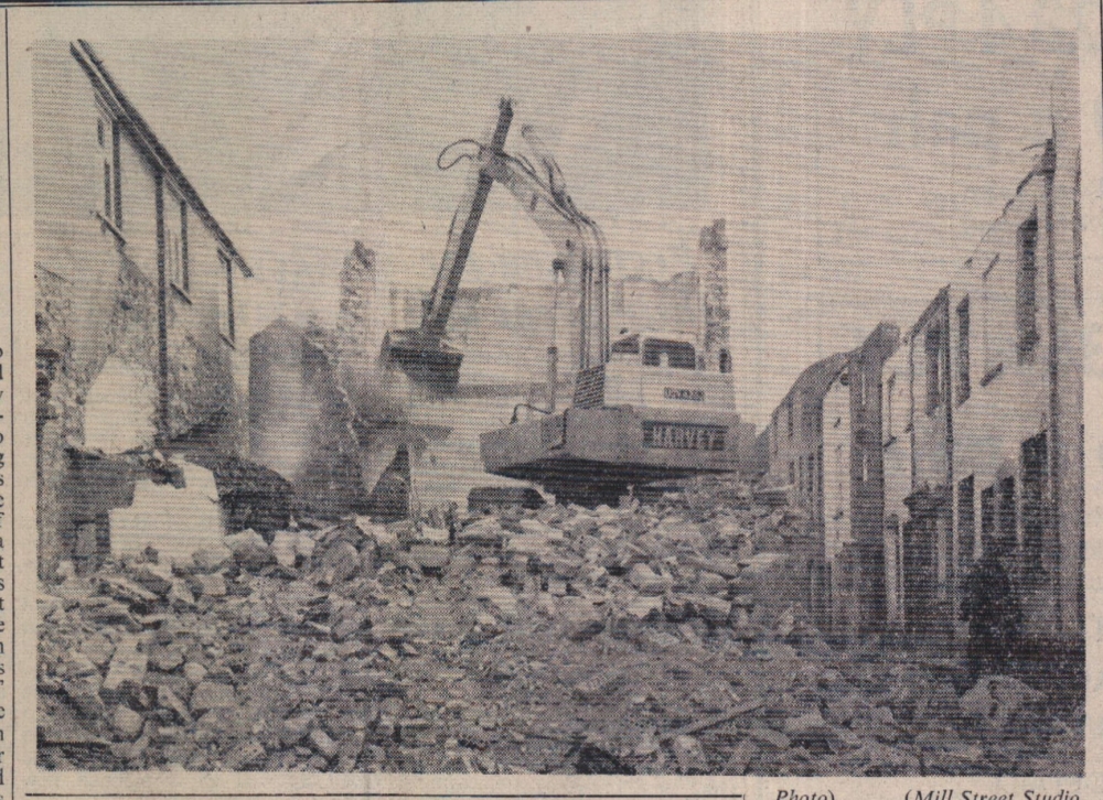 Farewell New Street! Bulldozers move into New Street, Bideford, which has been made a clearance area. Despite its name, this narrow street of character, between High Street and Lower Gunstone, was one of the oldest parts of the town. It is said that John Strange, the hero of the plague visitation of Bideford in 1645-46, owned a property there.