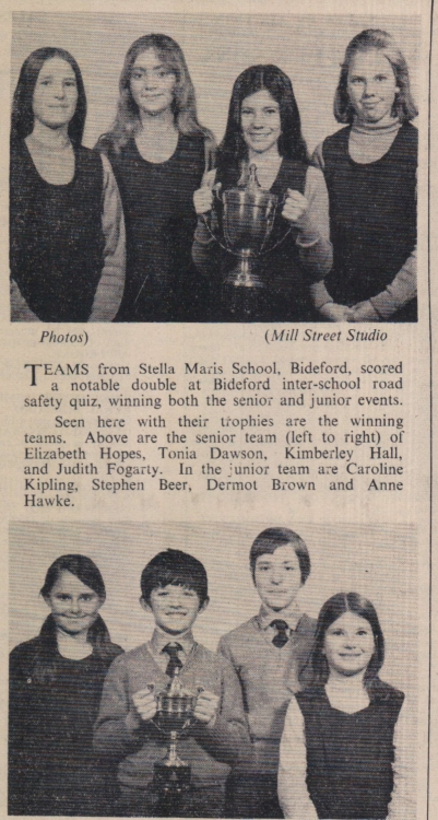 Winners of a new under-12 years old section of Northam urban district road safety quiz were St Margaret’s School, Northam, A team, seen here with plaques they received to mark their success. William Peacock, Kim Bernard, Carol Moorefield and Beverley Tutton. Teams from Stella Maris School, Bideford, scored a notable double at Bideford inter-school road safety quiz, winning both the senior and junior events. With their trophies are Elizabeth Hopes, Tonia Dawson, Kimberley Hall, Judith Fogarty, Caroline Kipling, Stephen Beer, Dermot Brown and Anne Hawke.