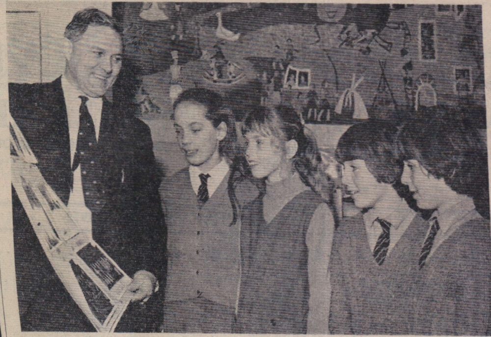 Preparing for their great day. The headmaster of the Blue Coat School, Mr R Barker, shows this year’s queen of Torrington May Fair, Jennifer Cramp, the crowner her sister Abigail, and the two heralds, the Gilbert twins Tony and Terry, pictures of last year’s preparation for this highlight of the town’s year.