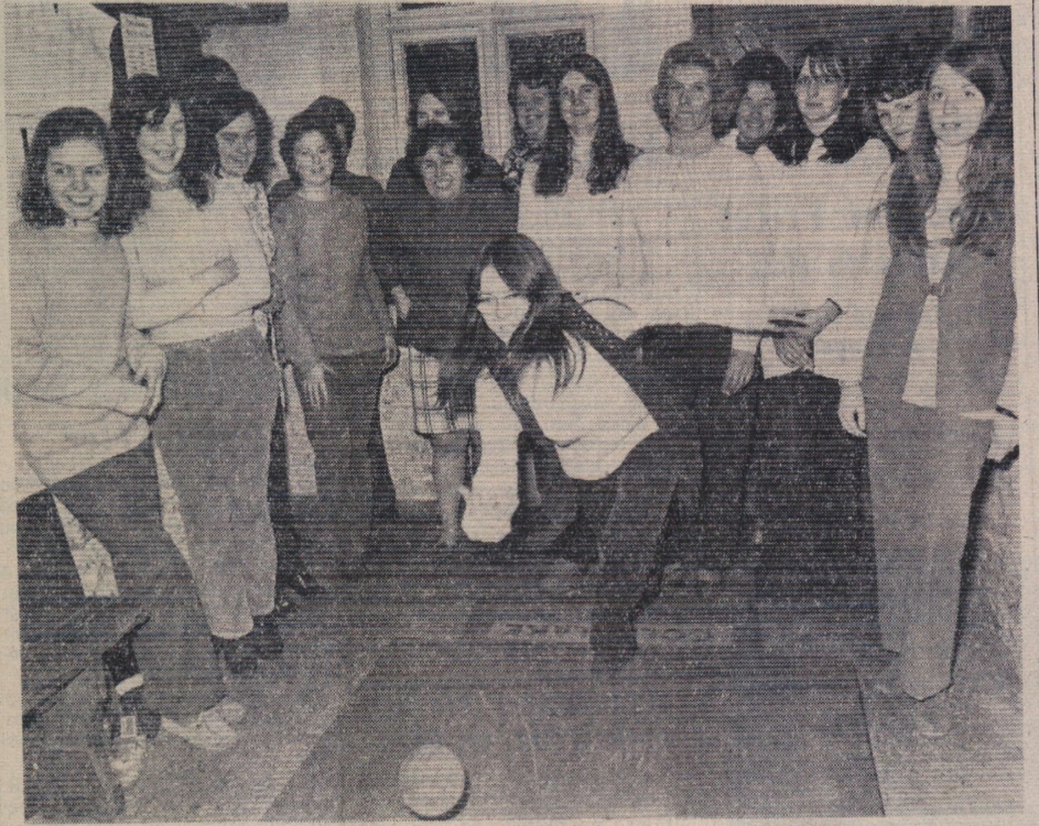 Women skittlers’ enthusiasm for the game is matched by skill, as reflected in this gathering at Buckland Brewer alley, the venue for special competitions recently. In the picture league players watch as Hermione Dennis, from Halsbury Cottages, sends a ball speeding.owards the pins.