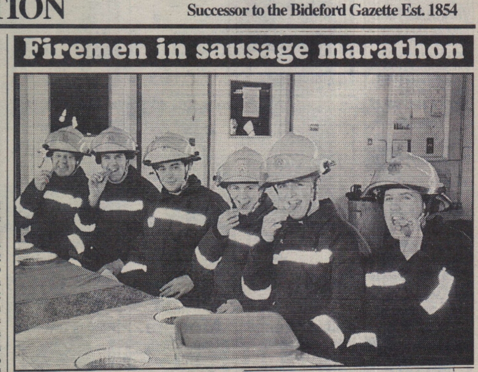 How many sausages could six firemen munch if six firemen munched steadily for 30 minutes? A prize awaited sponsors who came closest to answering the riddle at Bideford fire station. Firefighters tucked into a pile of hot-dog bangers to raise cash to send a local teenager suffering from muscular dystrophy on a holiday of a lifetime. Between them firemen Tony Lovell, Jeff Uttley, Jason Couch, Robert Slade, Andrew Blackwell and Andrew Curtis scoffed 152 hot-dog sausages and raised more than £200 for the cause. The firefighters were indebted to the help of Blackwell’s Pasty Shop for providing the sausages and Town and County Windows for providing the prize of a wall clock for the winning sponsor. Sponsor money is still coming in.