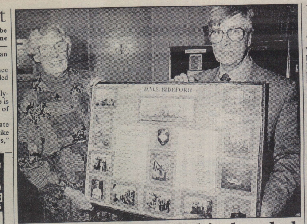 An idea born 12,000 miles away in Australia bore fruit in Bideford with the marking of an important piece of the town’s history. Bideford Rotary Club presented copies of a newly compiled history of the warship HMS Bideford, the last of five Royal Navy vessels to bear the town’s name, to both the town Mayor and the North Devon Maritime Museum. Its president, Tim Malone, also gave the museum a framed collection of photographs of the vessel. The idea for the presentation came from fellow Rotarian Martin Hulbert, of Queensland. A crewman on HMS Bideford during her wartime campaign, Mr Hulbert sent the local Rotarians his own potted history of the vessel and photographs taken during the war. Building on this information Bideford Rotary Club commissioned the production of a full history of the vessel from the time she was launched in 1931 to her de-commissioning in 1949. It has been lodged at the North Devon Maritime Museum at Appledore alongside a model of the vessel made by a former crewman from part of her stern, which was blown off when the ship took part in the evacuation of Dunkirk in 1940. Displayed at the handing-over ceremony was the Loving Cup given to the ship by the town of Bideford when her keel was laid in 1931, and a silver salver given by the ship’s captain following her ‘adoption’ by the town. Another slice of history was created by the unfurling of HMS Bideford’s battle Ensign which was flown at Dunkirk. It is believed to be the first time it was publicly unfurled since being given to the town 50 years ago.