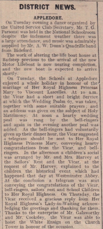 Work on altering the lifeboat house at Badstep, Appledore to accommodate the new Motor Lifeboat is now nearing completion. A dance organised by the United Services Club - Secretary, Mr T G Parsons - was held with the music supplied by Mr A W Dunn's Quadrille band. The Schools of Appledore enjoyed a holiday in honour of the marriage of Her Royal Highness Princess Mary to Viscount Lascelles. Through the kindness of Mr Hawkins, the takings at the Gaiety Cinema will be given to the United Services Club at Appledore (for discharged Soldiers and Sailors). The club, which has recently been opened is well patonized by the men of both services, but funds are greatly needed for defraying the necessary expenses.
