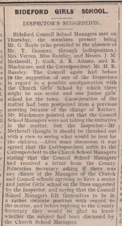 On the education front, attendance at the Old Town Boys’ School last month stood at 93.2%. A suggestion has been made that Bideford Girls’ School should amalgamate with the Church Girls’ School – it seems that the managers of each school are waiting for the other to respond first.