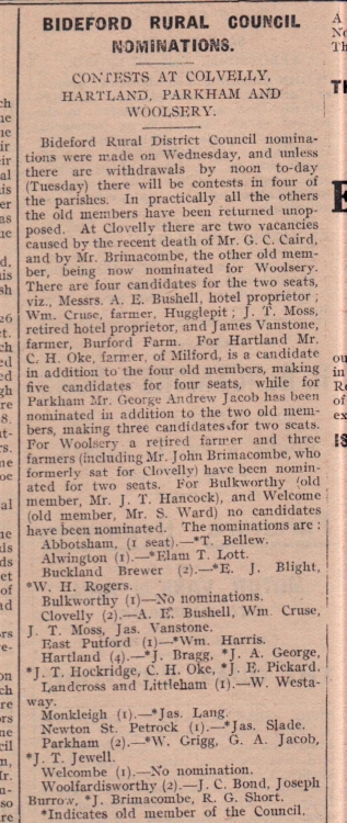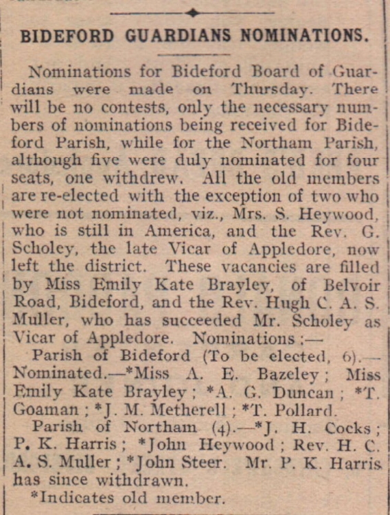 There will be no contests for nominations for Bideford Board of Guardians as only the necessary numbers were received. All the old members are re-elected with the exception of Mrs S Heywood and Rev G Scholey. Miss Brayley and Rev Hugh C A S Muller will fill the vacancies.