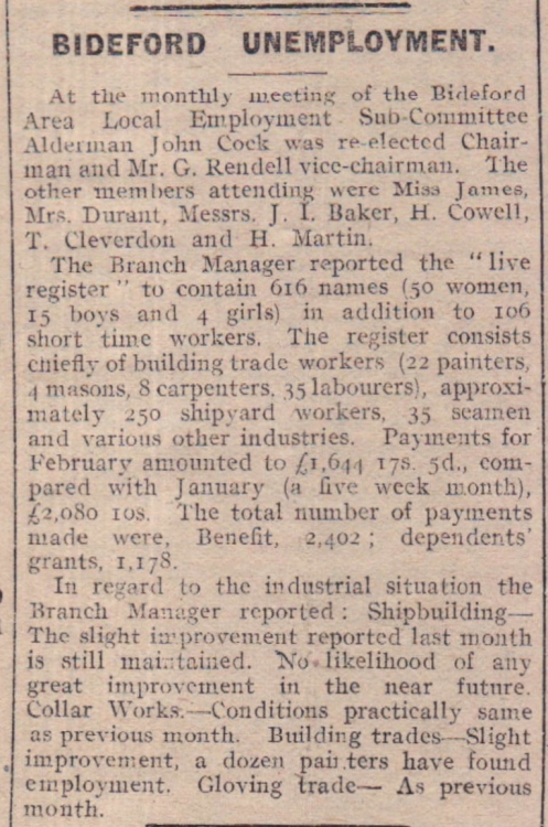 Unemployment also features again; 616 people from the Bideford region are registered unemployed this month, chiefly building trade and shipyard workers. This is a slight improvement on last month. There has also been a drop of around 3.5% on the national figures. Messrs Cock, Rendell, Baker, Cowell, Cleverdon and Martin, and Miss James and Mrs Durant are elected to the Bideford Area Local Employment Sub-Committee.