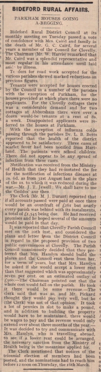 Following on from last month, Influenza is still very much on people’s minds in March. However, rates in the parish of Bradworthy are starting to decrease. With the exception of influenza colds passing through the parishes Dr L B Betts reported that the health of the district appeared to be satisfactory. Three cases of scarlet fever had been notified from Hartland - the patients were school children. Notification was received from the Ministry of Health that they had re-instated the fee for the notification of infections diseases at 2s 6d as from 31st August last in the place of the 1s to which it was reduced during the war. Mr J T Jewell: We shall have to use the Geddes' axe then.