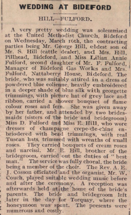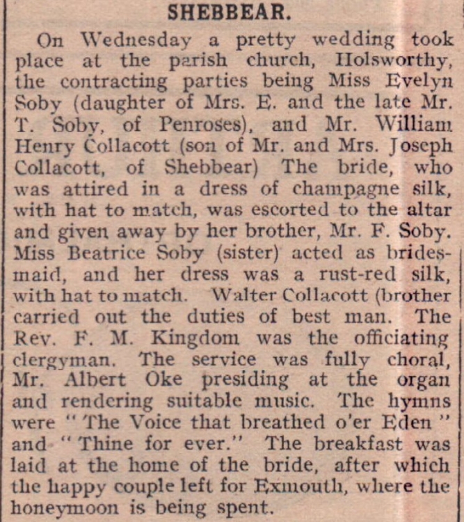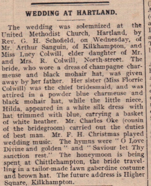 At the Holsworthy Parish Church, Miss Evelyn Soby married Mr William Henry Collacott; at the United Methodist Church in Bideford, Mr George Hill and Miss Lilian Annie Fulford were wed; and at Hartland, Mr Arthur Sanguin and Miss Lucy Colwill. Owing to recent family bereavements the wedding of Miss Prance, only daughter of Mr W Prance, bailiff at Berridon, to Mr Jack Bale, of Holnborough Farm, Morwenstone, was quietly celebrated. It took place in St John's Church, Bradworthy. The bride was led to the altar and given away by her father. She was prettily attired in an ivory georgette dress with veil to match. The only ornament she wore was her deceased mother's engagement ring. Her brother, Mr Lionel Prance, was the best man. The hymn, "The voice that breathed o'er Eden" was sung at the service, and the Wedding March was ably played by Mr Stanley Oke. In the afternoon the bride and bridegroom left by motor for South Devon for the honeymoon. The bride's going away dress was a black silk with hat to match. She also wore a black wrap. The happy couple will reside at a farm in Morwenstowe.