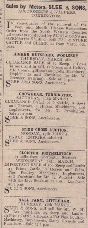 Following the removal of Foot and Mouth restrictions from 6 March, cattle markets are preparing to restart livestock sales. Hartland Cattle Market will reopen on 11 March, and among the first people selling stock at Torrington market are - Mr W Tremeer of Higher Hutsford, Woolsery, who is retiring; Mr T Pennington, Crowbear, Torrington; Mr W H Lee, Hall Farm, Littleham, who is “quitting”; and Mr L Wickett at Cloister in Frithelstock - this must be a big event as it is announced that luncheon will be served at 1pm.