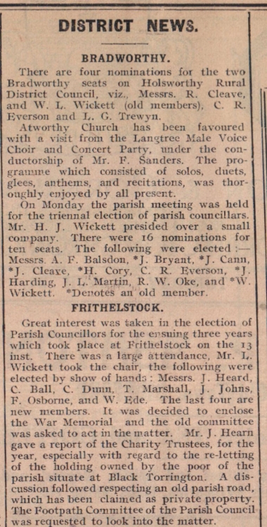 With a General Election due late in 1922 and Local Rural and Council Elections taking place in late March, there is considerable coverage of nominations and results from all areas throughout the papers in the District News columns. The following have been elected; Bradworthy - Messrs Balsdon, Bryant, Cann, Cleave, Cory, Everson, Harding, Martin, Oke and Wickett; Frithelstock - Messrs Heard, Ball, Dunn, Marshall, Johns, Osborne and Ede; Parkham - Messrs Harding, Ley, Jacob, Dack, George, Heal, Hedden, George, Sanders and Beer; Shebbear - Messrs Pett, Earle, Griffin, Hocking, Leach, Vanstone, Gloin, Rouncefell and Quance.