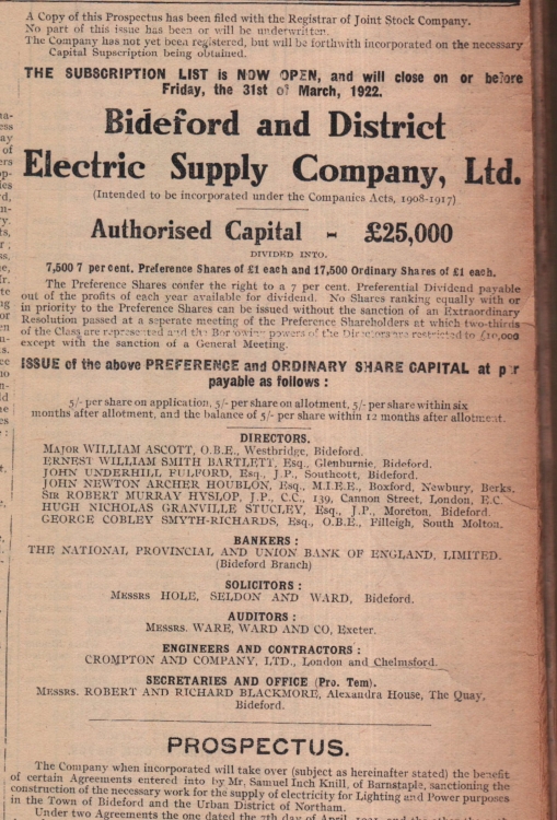Bideford and District Electric Supply Company issues its prospectus. Local directors are Major William Ascott, OBE - Westbridge; Ernest William Smith Bartlett, Esq - Glenburnie; John Underhill Fulford, Esq - Southcott; Hugh Nicholas Granville Stucley, Esq - Moreton.