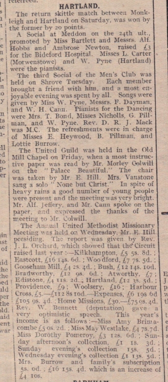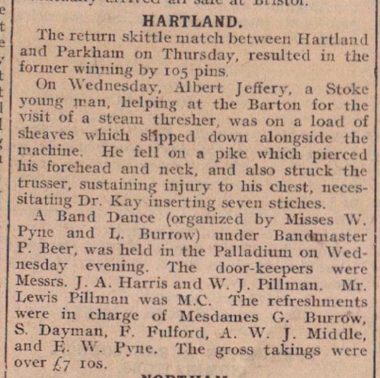 In Hartland news - a Stoke man, Albert Jeffery, was injured when he fell on a pike necessitating Dr Kay to insert stitches. A Band Dance was organised by Misses W Pyne and L Burrow, under P Beer, Bandmaster, was held in the Palladium. A Social was held at Meddon promoted by Miss Bartlett and Messrs Hobbs and Newton, and the third social of the Men's Club was held.