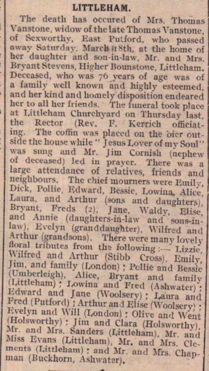 The death has occured of Mrs Thomas Vanstone, widow of the late Thomas Vanstone, of Sexworthy, East Putford, who passed away March 18th at the home of her daughter and son-in-law in Littleham.