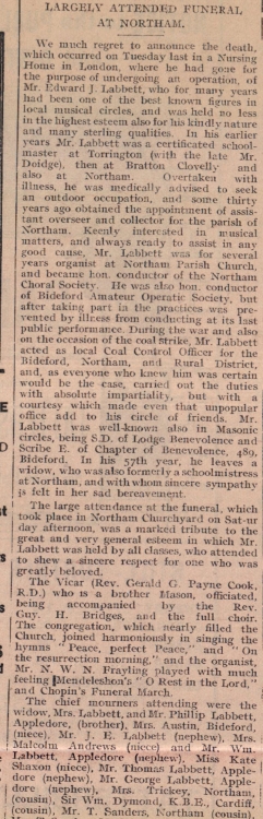 In more Instow news, Mr H Miles has been re-elected representative for Instow on Barnstaple Rural District Council. Mr G F Lefroy applied to the County Bench for a protection order for Ernest King in respect of the Marine Hotel, Instow. Supt R S Eddy, whilst offering no objection, protested against the shortness of the notice received. The application was granted. At the Parish Meeting held in the Vestry Room for the election of the Parish Council, Mr J P England presided. Only nine nominations were handed in for the nine seats, and these were old members, who were as follows - Thomas Anstey jnr, John Cann, William P M Dark, Ernest Joslin, Evan Martin, Harold Miles, Thomas Molland, Henry Turner, and William H Welch. The funeral of the late Mr Joseph Shackson mariner, of Torridge Cottage, Instow, has taken place. Deceased, who was 81 years of age and a native of Clovelly, leaves a widow, a son, and five daughters. The Rev W T L Jenkins officiated and the principal mourners were Mr Ernest Shackson, Miss Emily Shackson, Mr and Mrs J Dodwell, Miss B Shackson and Miss Evalina Shackson, Mr W Dark and Miss C Dark, Mrs J Pidler, Mr J Pidler, Mr Sydney Pidler, Mr J Dark, Mrs Fred Dark.