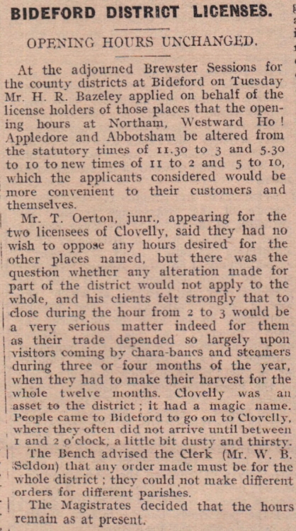 At the adjourned Brewster Sessions, two licensees of Clovelly question whether a change in opening hours should apply to them.