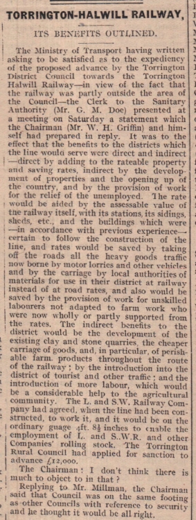 Mr Neil McLean asked the Minister of Labour in the House of Commons whether a sum of money had been granted by the Government in connection with the Torrington and Halwill Light Railway scheme; whether contracts had been entered into for the supply of materials, and at what date it was anticipated a start could be made. Mr Arthur Neall: The North Devon and Cornwall Junction Light Railway Company has been informed that the Government are prepared, subject to the fulfilment of certain conditions, to contribute a sum not exceeding £125,000 towards the cost of construction. I understand that the company hopes to execute a contract for the works this month, and that the contractors will be able to start work on the railway immediately thereafter if the conditions have been complied with. Torrington District Council outlined the benefits, both direct and indirect, to the districts that the line would serve.