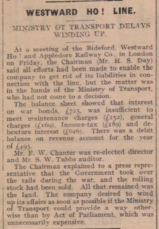 The Ministry of Transport is accused of delaying the winding up of the Bideford, Westward Ho! and Appledore Railway Co.