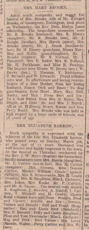 The funerals of Mrs Brooks, wife of Mr Richard Brooks, of Goosegreen, Torrington and Mrs Elizabeth Barrow, took place.
