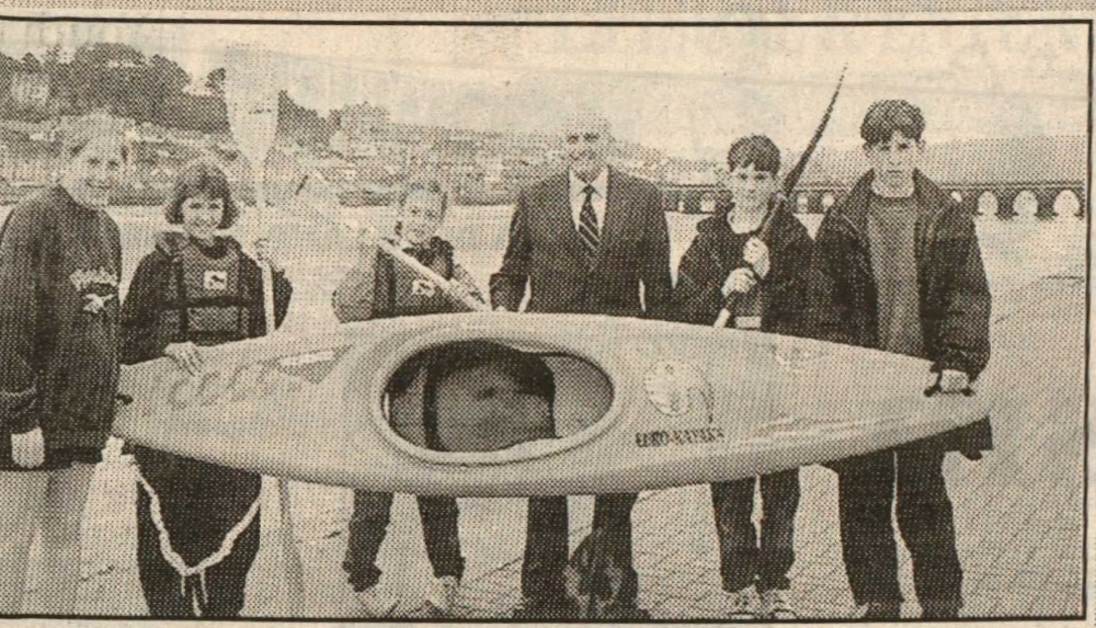 With thanks to a £300 grant from Bideford Bridge Trust, the younger members of Bideford Canoe Club will take to the water in a child-sized Kayak canoe when the new season opens in May. Caroline Parkinson, Andrew and Christopher Eastman, Hannah Toon and Helen Hydes, are in the picture with Doug Vickers, Bideford Bridge Trust.