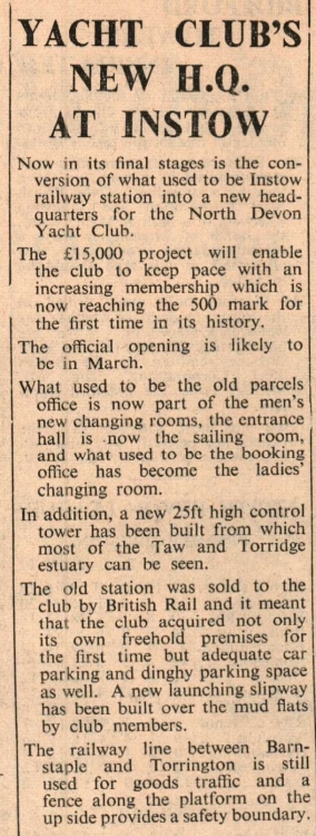 A milestone of achievement in the history of the North Devon Yacht Club at Instow was reached when their new headquarters were officially opened by Mr Owen Aisher, President of the Royal Yacht Association. Also attending were Mr R. Day (Club Vice-Commodore), Mr Peter Phillips (Club Commodore), Mr P. Water and Mr G. Metcalf.