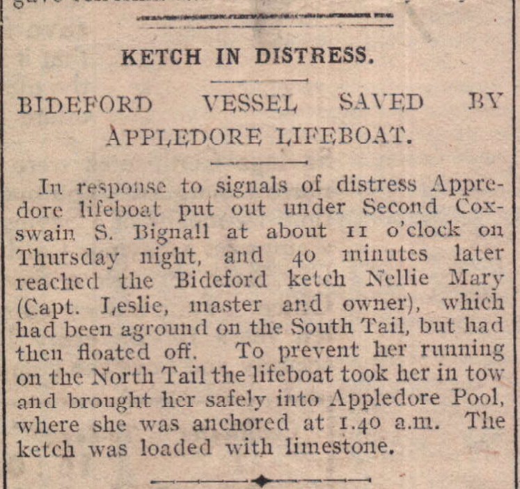 In shipping news, the Bideford ketch Nellie Mary, Captain Leslie being the master and owner, was under way loaded with limestone. She sent out distress signals at 11pm after grounding on the South Tail. The lifeboat towed her into Appledore Pool where she was safely anchored at 1.40am.