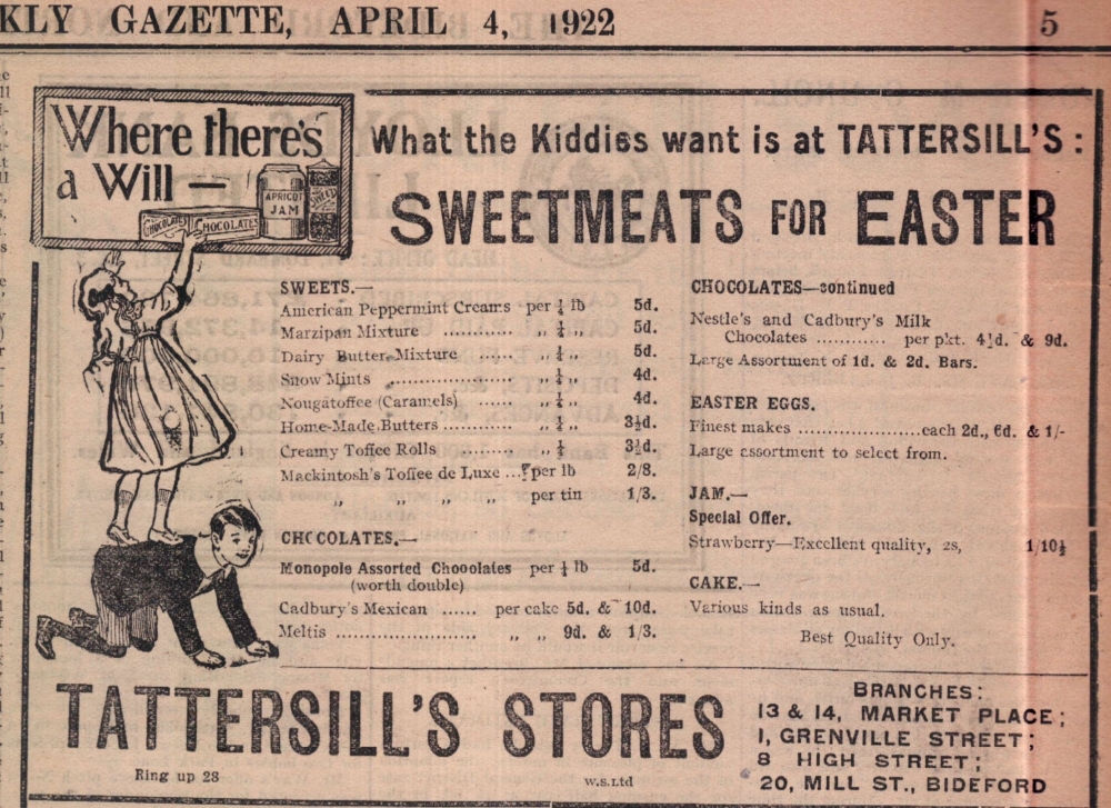 With Easter Sunday on 16 April 1922, parents are encouraged to buy treats for their kiddies from Tattersill's