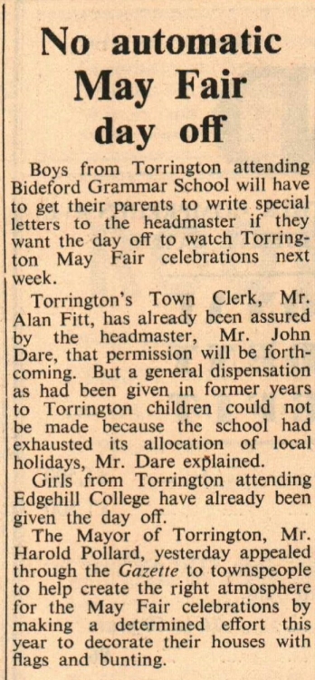 Boys from Torrington who attend Bideford Grammar School will not automatically have May Fair day off and will require permission from the headmaster, Mr John Dare.