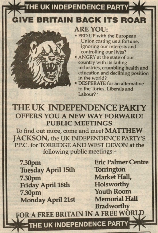 Matthew Jackson, the UK Independence Party’s PPC for Torridge and West Devon is holding public meetings.