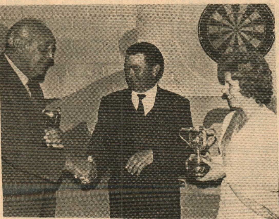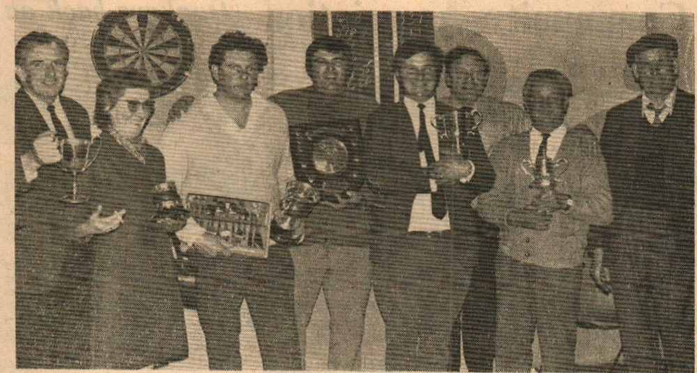 Pictured with their trophies are the chief winners at Bideford and District Darts League’s finals night held at the Bideford Centre. The Lamb Chops, winners of the sixes and threes in Division I and pairs and champion of champions cups pose with Mrs G Andrews, wife of the licensee of the Lamb – K Keen, O Trick, R Neale, D Heaman, K Hopkins, C Davey, I Warman. Singles winner Mervyn Parrish is congratulated by runner-up Herbie Smale as the Darts Queen, Mrs Beryl Sleigh, presents the trophy.