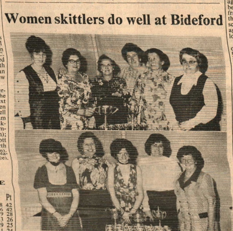 Two teams who have had a successful season in the Bideford Women’s Skittles League are the Tornadoes and the Coasters. The Tornadoes, who play at Bideford Liberal Club, won the champion of champions trophy and the Division II championship in their first year together. They are Mesdames E Beer, C Conebear, S Spry, M Clements, Miss E Jones and Mrs J Bell. The Coasters were runners-up in Division I and took the J Venus Cup for the highest away aggregate as well as the Sally Braddick and Mother’s Pride knock-out trophies. But winning trophies is no new thing for the Coasters. In the past six years they have won the J Venus cup six times, the Mother’s Pride cup three times, the Sally Braddick Rosebowl twice and the Gladys Fulford fruitbowl once. In this period, too, they have been champion of champions twice, Division I champion three times, and runners-up twice. And one of their members, Mrs G Redclift, has taken the individual trophy for the highest away scores. They are Miss J Copp, Mrs V Headon, Miss D Copp, Mrs G Redclift, and Mrs F Copp. Missing is Mrs D Woolridge.