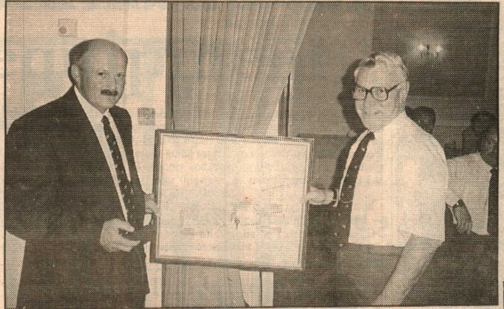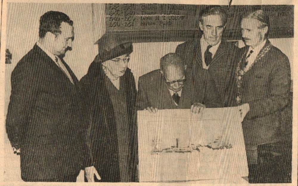 When MP Mr Kenneth McIver, of Northam, Western Australia, presented in Northam, Devon, a plaque bearing the coat of arms of his town there was a direct family link. In the photograph – Mr Kenneth McIver, Mrs Reynolds, Dr Reynolds, Mr James Paterson and Council chairman Mr R H K Evers.