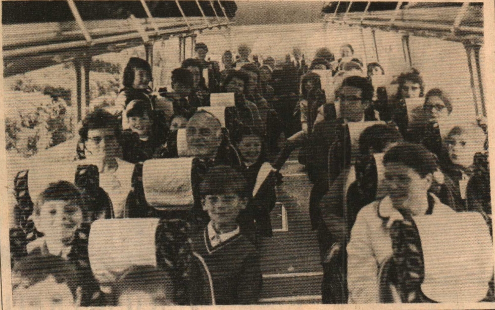 All smiles as one of the eight coachloads of children and teachers from Bideford Westcroft Junior School, and parents, prepare to set off on a day trip to the Dart Valley. They enjoyed what for many of the children was a novelty – a ride on the Dart Valley Railway – with lunch at Staverton Bridge. A steamer trip up the Dart followed. The 200 children were on their way home before a jinx revealed itself. Inexplicably a windscreen on one coach shattered and then another coach broke down. A relief vehicle arrived, passengers transferred and then that coach also broke down. The second relief arrived home about 11.30pm – three hours after the other passengers. But all voted it a great day.