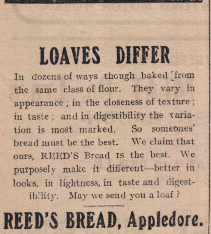 In food related stories, Wyatt’s Stores in Westward Ho! offer Boar’s Head Brawn and Galantines of Chicken alongside the usual ham and tongue. Eggs for pickling are available from L D Moseley, Staddon Poultry Farm, Appledore, while Mr Reynolds of Velly, Clovelly, will buy Bacon Pigs on behalf of the Central Wiltshire Bacon Co of Devizes. There's a battle of the bread producers - whose bread is best? - Reed's of Appledore lays claim!