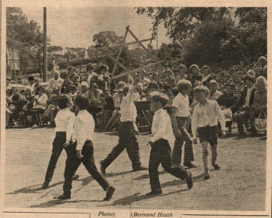 Part of the famous Sleights sword dance by boys of Abbotsham County Primary School was a highlight of the annual parish fete held, as the Vicar, Rev R A Ford, described it, on ‘the one and only day of summer.’ Some of the boys learned the dance at a children’s house party at the Folk and Music Centre at Crocombe, near Taunton, at Easter and, with the aid of the headmistress, taught the others. The fete realised a profit of £245 for parish needs. The hall, the church, the school and the chapel will benefit. Mrs R O H Eppingstone, wife of the Rural Dean, opened the fete.