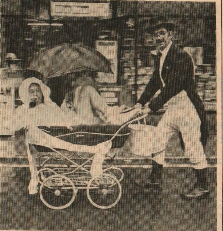 Two patrons of the Appledore Inn, Bideford, indulged in lighthearted fun and also raised £60 for a good cause. Prompted by the landlady of the inn, Mrs Sheila Dinner, Mr Keith Eldridge, dressed up and pushed his companion, Mr Tom Lobbett, who was disguised as a baby, through the streets of Bideford in a pram. The money will be used to take a party of local old-age pensioners on an outing in September.