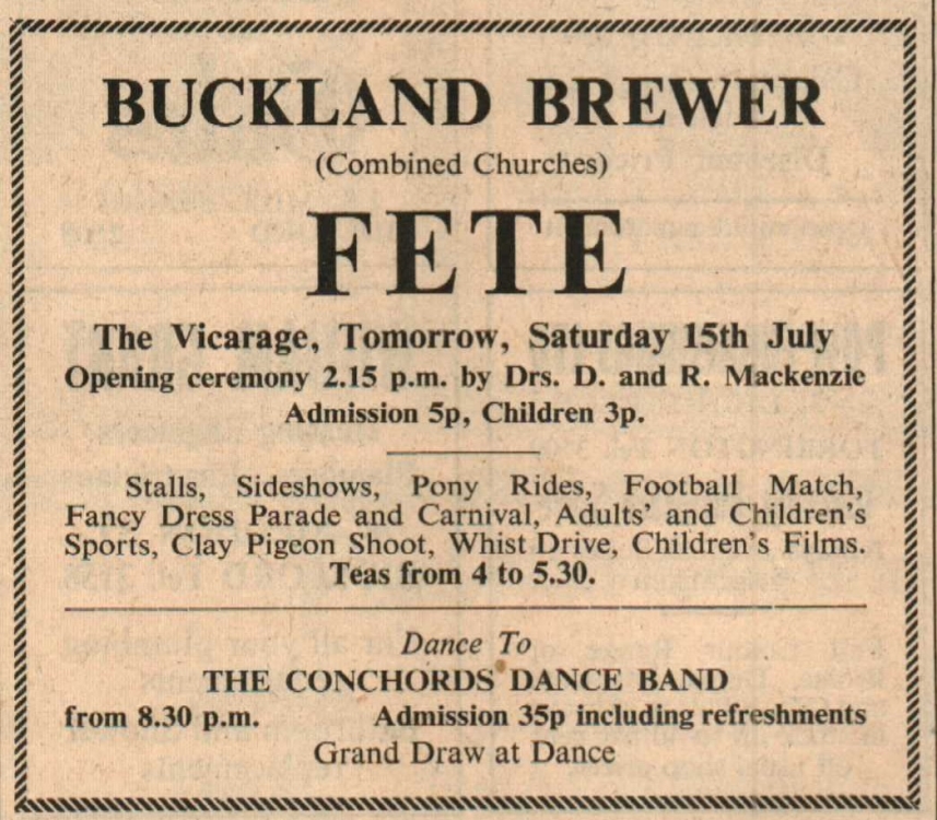 Buckland Brewer Fete takes place on Saturday 15 July and will be opened by Drs D and R Mackenzie.