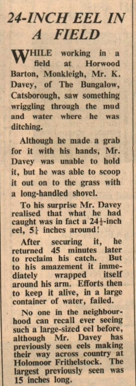 Mr K Davey, of The Bungalow, working in a field at Horwood Barton, Monkleigh, catches an eel.