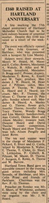 A fete marking the 57th chapel anniversary of Hartland Methodist Church had to be held indoors because of unsettled weather. Despite this £160 was raised as a result of the weekend. The event was officially opened by Mrs Julie Goaman, of Shebbear, who was presented with a bouquet by Lisa Manley. Hartland Town Band gave an enjoyable concert in the evening, guest artists including Mrs Boundy, of Shebbear, and Mrs Colin Priest and friends of Parkham. Chairman was the Rev F G Thomas. Preacher on Sunday was Mr E Short, of Whitstone, anthems were sung by the choir and the organist was Mr J W Heard.