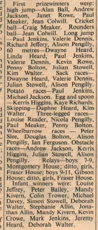 School sports at Hartland. On behalf of Fraser House, of which they are captains, Julian Stowell and Ann Ferguson, received the house championship cup from Mr A George, chairman of the school managers at Hartland School sports.